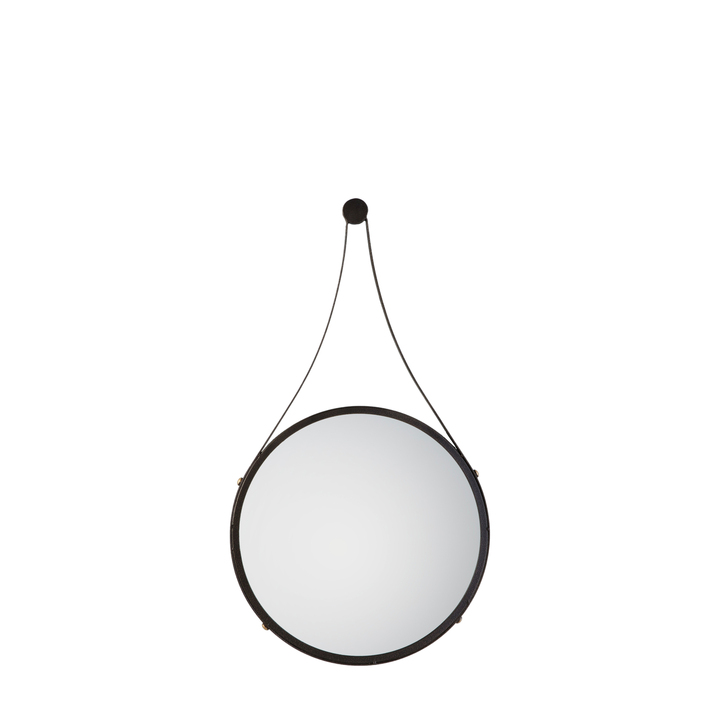 Add a slightly industrial feel to a wall with this unusual mirror which features a metal surround and 'hanging strap'. Larger size also available. Material: Glass / Iron / MDF Type - Mirror: Wall Style - Mirror: Accent Shape - Mirror: Round Hanging Orientation: Portrait Glass Type: Plain Frame Width: 20mm Fixing Type: Keyhole