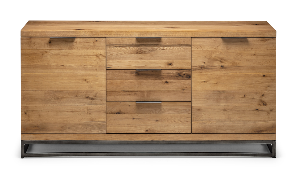 Materials: Solid Oak With Veneers & Metal {• |||product feature 1}• Featuring industrial style metal legs. • Featuring two spacious cupboards with shelves, and three drawers,. • H75 x W150 x D45cm, Weight 77.9kg • x1 Sideboard/Cabinet. • DIMENSIONS: Height 75 x Width 150 x Depth 45cm, Net Weight 77.9kg • WHAT'S INCLUDED: You will receive x1 Sideboard/Cabinet. Partial Assembly Required - Handles Only. Level of Assembly Required: Partial Assembly Required - Handles Only Build Time: 0.0 $ Total Net Weight: 77.9 Cleaning Instructions: Wipe Clean with Dry Cloth