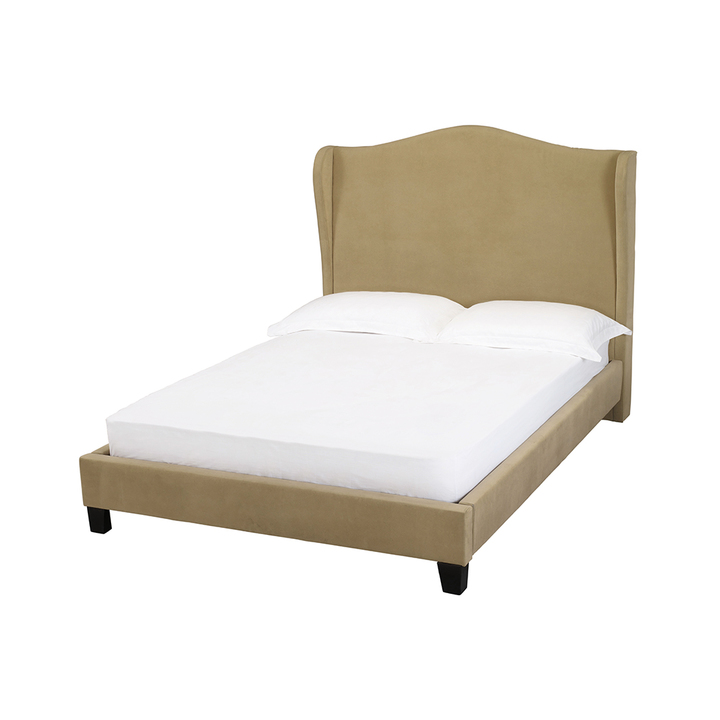 "The Soft Beige Chateaux King Size Bed is an impressive addition to our fabric bed range. Finished in a luxurious velvet, the full height headboard with dramatic wings, gives this bed frame a stately appeal. The low foot end and black legs lend themselves perfectly to the design, not detracting from the traditional and opulent style of the striking headboard. Brought together with a sprung slatted base, this exceptional bed will give any bedroom a traditional and well-styled look. "