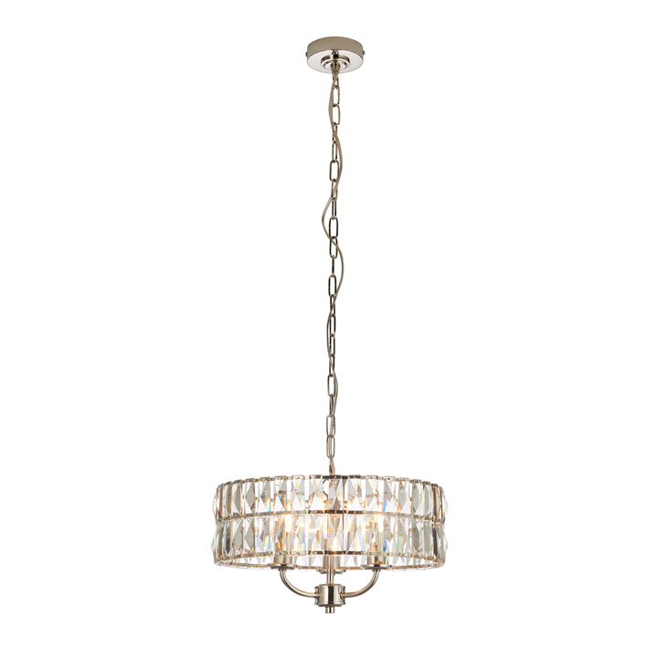This 3 light pendant features stunning decorative clear cut faceted glass with gorgeous bright nickel plated metal accents. Hung from a height adjustable chain this pendant creates an eye-catching pattern of light making it the perfect statement piece for any room. Material: Steel / Glass Bulb Quantity: 3 Bulb Type: 6W LED E14 Product Lumens: 470 Lumens Per Watt: 78 Cable Length: 1200mm Dimmable: Yes Voltage: 220-240V Class: Class 1 IP Rating: 20 Additional Information: Adjustable Drop 400 - 1420mm