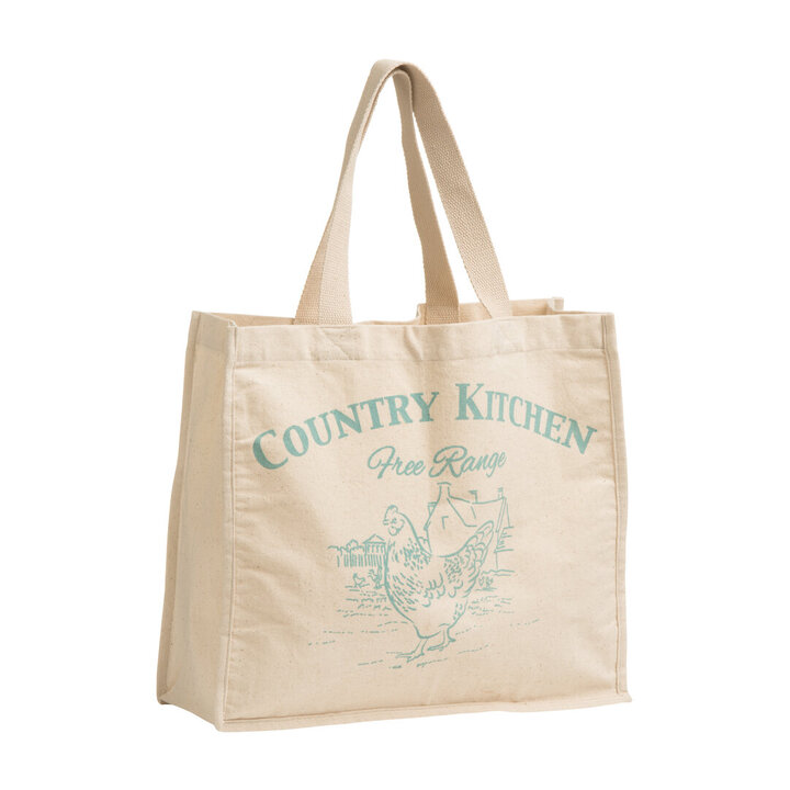"Today we are trying to do our best to preserve the planet, and with the Country Kitchen shopping bag, we provide a reusable bag that will be better for the environment. Made from cotton, the bag is weaved together creating a strong, yet lightweight, material which is perfect for carrying your messages from the shop. Accentuated on the natural bag, beautifully designed hen design and worded 'country kitchen' in blue give the bag a modern, yet rustic look. Two cotton handles are securely attached, so you will be able to carry your messages knowing that the bag won't burst. So whether you are popping round to the shops for a couple of messages or going for a big shop, the stylish Country Kitchen cotton canvas bag looks great as you carry your essentials home."