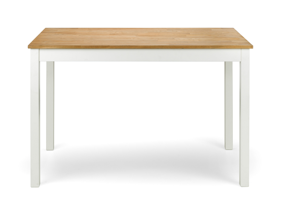 Materials: Solid Oak & Oil Finish {• |||product feature 1}• A compact, classic and timeless table that is perfect for small kitchen diners.. • A Wide range of co-ordinating items are available in the Julian Bowen Coxmoor range making it ideal for any home situation. Also shown with the Julian Bowen Hudson Chairs.. • H75 x W118 x D75cm, Weight 22.0kg • x1 Dining Table only. Chairs not included. • Classic and Durable: The Julian Bowen Coxmoor Rectangular Dining Table in ivory/oak features a timeless design with sturdy construction. Ideal for family meals and gatherings, it combines style and functionality. • Easy to Clean: The table's smooth surface makes it easy to wipe clean, ensuring it remains looking great even after years of use. The durable finish protects against daily wear and tear. • Versatile Design: This dining table complements various decor styles, making it a versatile addition to any dining room or kitchen. Its classic design ensures it remains stylish for years to come. • DIMENSIONS: Height 75 x Width 118 x Depth 75cm, Net Weight 22.0kg • WHAT'S INCLUDED: You will receive x1 Dining Table only. Chairs not included. Full Assembly Required. Level of Assembly Required: Full Assembly Required Build Time: 20.0 $ Total Net Weight: 22.0 Cleaning Instructions: Wipe Clean with Dry Cloth