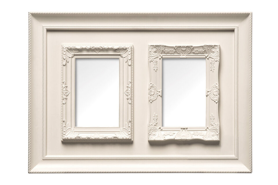 "Embossed decorative patterns form a border around the outer edge of this dual photo frame, becoming more elaborate around the inner sections. With two glass paned mounts it's ideal for exhibiting snaps taken of favourite people or places. Made from strong, smooth plastic, it features a clean white finish, perfect for setting against a neutral coloured wall." materials: Glass, Synthetic composition:Synthetic, Glass Care & Use Instr: Dust clean with a dry cloth Dishwasher Safe: N Electric Hob Safe: N Freezer Safe: N Gas Hob Safe: N Halogen Hob Safe: N Induction Hob Safe: N Materials: Glass, Synthetic Microwave Safe: N Oven Safe: N Product Depth: 3 Product Height: 33 Product Weight (kg): 0.7 Product Width: 45 Item Assembled: Y