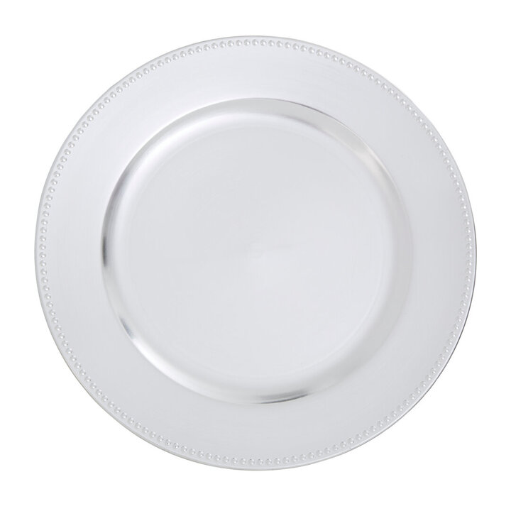 Elegantly designed with smooth edges and dotted patterned border, this silver charger plate is an ideal tableware addition for the festive season and more. materials: Synthetic composition:Polypropylene 100% colour: Silver Care & Use Instr: Wipe clean with a dry cloth Dishwasher Safe: N Electric Hob Safe: N Freezer Safe: N Gas Hob Safe: N Halogen Hob Safe: N Induction Hob Safe: N Materials: Synthetic Microwave Safe: N Oven Safe: N Product Depth: 33 Product Height: 2 Product Weight (kg): 0.32 Product Width: 33 Item Assembled: N Courier Service: Evri Packet