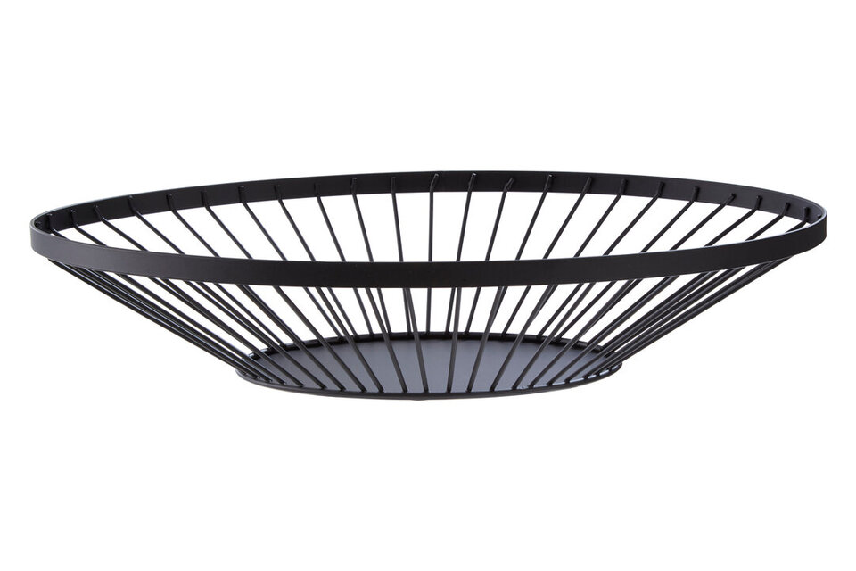 "Matte black finish iron forms a rounded design of this fruit basket with angular sides, a wide top and a flat base. The open frame lets the stored produce ripe over time and keeps it fresh for longer." materials: Metal composition:Iron 100% colour: Black Care & Use Instr: Wipe clean with a damp cloth Dishwasher Safe: N Electric Hob Safe: N Freezer Safe: N Gas Hob Safe: N Halogen Hob Safe: N Induction Hob Safe: N Materials: Metal Microwave Safe: N Oven Safe: N Product Depth: 26 Product Height: 8 Product Weight (kg): 0.415 Product Width: 40 Item Assembled: Y Courier Service: Evri Packet