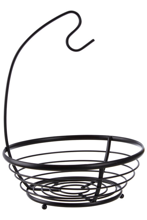 "Crafted from an open wireframe in a matte black finish, this fruit basket features a sleek handy hook for hanging bananas. This sturdy basket provides a functional way to display and store the contents in style." materials: Metal composition:Iron 100% colour: Black Care & Use Instr: Wipe clean with a damp cloth Dishwasher Safe: N Electric Hob Safe: N Freezer Safe: N Gas Hob Safe: N Halogen Hob Safe: N Induction Hob Safe: N Materials: Metal Microwave Safe: N Oven Safe: N Product Depth: 26 Product Height: 33 Product Weight (kg): 0.81 Product Width: 26 Item Assembled: N Courier Service: Evri Packet