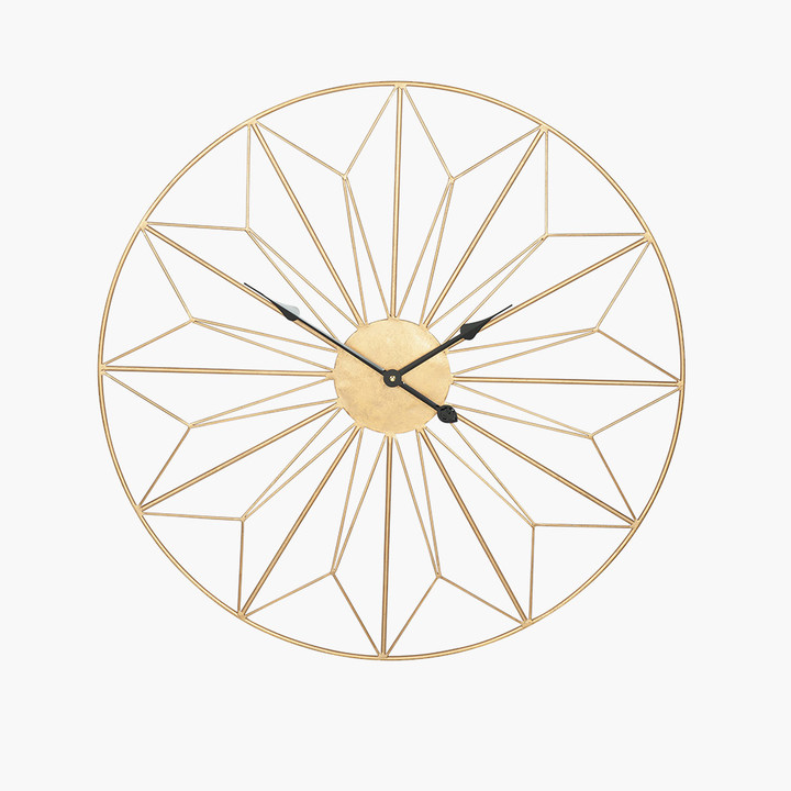 Make a statement on your wall with this geometric designed large metal wall clock finished in antique gold metal. Batteries included: No Battery warning label: Yes Brochure Box Type: Standard Brochure Description: Gold Metal Geo Design Round Wall Clock CBM: 6.6400000000000001E-2 Clock face details: No numbers Clock warning label: Yes Country of origin: China Hook type: Keyhole Mail order packaging: 1 Master code: 75-199 Material 1: Metal Material 2: n/a Material composition (%): Iron 95%, Plastic 5% Number of batteries: 1 Number of product boxes: 1 Outer box depth (front to back): n/a Outer box height (top to bottom): n/a Outer box quantity: n/a Outer box weight: n/a Outer box width (side to side): n/a Packaging status: 3 Polybag warning label: Yes Product status: 3 Product weight: 1.4 Single product depth (front to back): 4 Single product height (top to bottom): 77 Single product width (side to side): 77 Spec sheet: Clocks Type of battery: Alkaline, AA UKCA/CE label: Yes User guide included: No Variant position: 1 Wall hanging warning label: Yes Colour 1: Gold Colour 2: Black