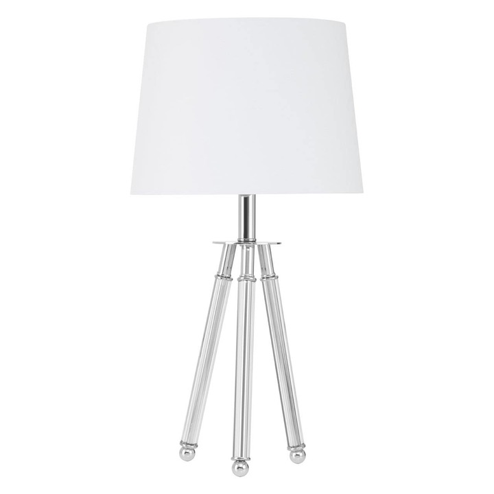 This table lamp's trio legs are crafted from chrome finish metal and covered with translucent crystal. The tripod design ensures its stability on the tabletop while metallic silver ball feet add a minimal decorative appeal. The white fabric shade contributes to its pleasing aesthetic and complements lamp?s overall minimalist design. materials: Textile, Glass composition:25% Marble, 50% Iron, 20% Glass, 5% Plastic Bulb Included: N Bulb Info: 1 Qty E27 60W Care & Use Instr: "Wipe With A Soft Cloth, Do Not Use Abrasive Cleaners." Dishwasher Safe: N Electric Hob Safe: N Freezer Safe: N Gas Hob Safe: N Halogen Hob Safe: N Induction Hob Safe: N Materials: Textile, Glass Microwave Safe: N Oven Safe: N Product Depth: 33 Product Height: 63 Product Weight (kg): 1.6 Product Width: 33 Item Assembled: N