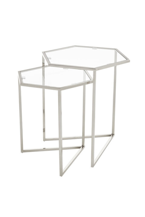 This set of two tables has a stackable design that offers compact storage. Made from silver finish steel, each table features clean lines which bend to form a hexagonal top with mirrored glass insert and an open triangular base. materials: Metal, Glass composition:70% Iron, 20% Glass, 10% Wood Care & Use Instr: "Clean With A Soft Damp Cloth, Do Not Use Abrasive Cleaners" Dishwasher Safe: Y Electric Hob Safe: Y Freezer Safe: Y Gas Hob Safe: Y Halogen Hob Safe: Y Induction Hob Safe: N Materials: Metal, Glass Microwave Safe: N Oven Safe: N Product Depth: 54 Product Height: 58 Product Weight (kg): 9.05 Product Width: 54 Item Assembled: Y