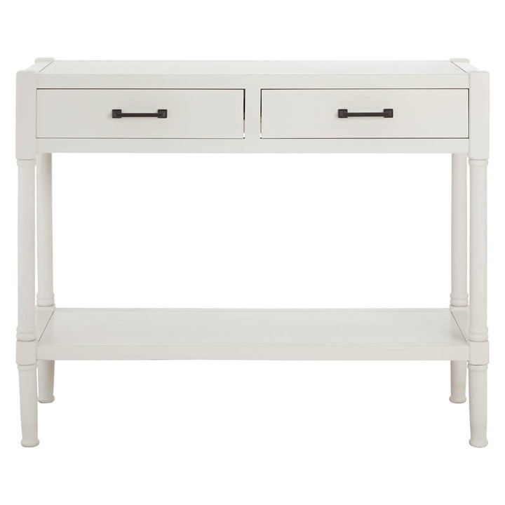 Made from natural wood, this table will stand out with its subtly carved construction and pearl white finish. Two matching pull out drawers have metallic handles with a sleek design that coordinates with the straight lines of the table. A lower shelf offers additional storage or display space. materials: Wood, Wood composition:Synthetic, Textile, Wood Care & Use Instr: Wipe with a soft cloth, do not use abrasive cleaners. Dishwasher Safe: N Electric Hob Safe: N Freezer Safe: N Gas Hob Safe: N Halogen Hob Safe: N Induction Hob Safe: N Materials: Wood, Wood Microwave Safe: N Oven Safe: N Product Depth: 35 Product Height: 75 Product Weight (kg): 11 Product Width: 91 Item Assembled: N Product Load Bearing Weight: 30kgs Floor to Under Table: 16.5cm Table Height: 75cm