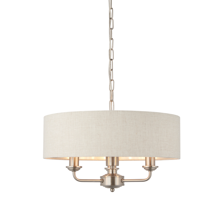 This pendant is a sophisticated mix of natural linen fabric with a reflective brushed metallic inner and brushed chrome metalwork. This beautiful pendant is the perfect timeless addition to modern and classic homes of today. Material: Steel / Fabric Product Zone: Indoor Bulb Included: No Bulb Quantity: 3 Bulb Type: 3 x 40W E14 candle Cable Length: 1000mm Dimmable: Dimmable Voltage: 220-240V Class: Class 1 IP Rating: 20 Additional Information: 350mm to 1200mm adjustable drop