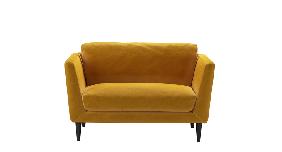 The Holly's retro-inspired shape and simple elegance is a nod to the sleek and curvy mid-century style. A neat frame - with high, splayed arms, a deep seat, and lots of comfy cushions - sits on tall tapered legs. This is one cool sofa... back cushions: feather color: yellow covers: fixed seat cushions: feather wrapped foam size: Loveseat
