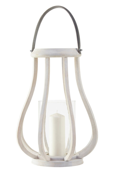 The frame of this handcrafted lantern is made from eco-friendly mango wood, and has a weathered finish that accentuates its grain. Its bulbous lines house a clear glass hurricane shade designed to hold a tealight or small pillar candle. It features a strap made from genuine black leather trimmed with white thread, and silver metal bolt detail on the rim. materials: Wood, Glass, Natural composition:Mango wood 0%,Glass 0%,Genuine leather 0% colour: White Care & Use Instr: "Please note, this product composition contains natural wood, variations in colour may apply." Dishwasher Safe: N Electric Hob Safe: N Freezer Safe: N Gas Hob Safe: N Halogen Hob Safe: N Induction Hob Safe: N Materials: Wood, Glass, Natural Microwave Safe: N Oven Safe: N Product Depth: 40 Product Height: 53 Product Weight (kg): 3.1 Product Width: 40 Item Assembled: Y Courier Service: Evri Light & Large