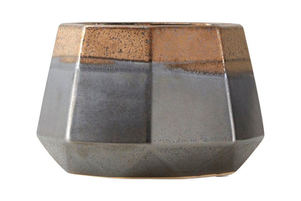 "Its warm copper and deep silver hues give the Jet planter immediate metallic appeal. Both colourways have a weathered finish that lends the planter texture, making it a tactile as well as visually appealing decorative piece. Crafted from porcelain, its angular design creates a distinctive hexagonal rim." materials: Natural composition:Porcelain 100% colour: Silver, Gold Capacity: 1.2L Care & Use Instr: Wipe With Soft Cloth Dishwasher Safe: N Electric Hob Safe: N Freezer Safe: N Gas Hob Safe: N Halogen Hob Safe: N Induction Hob Safe: N Materials: Natural Microwave Safe: N Oven Safe: N Product Depth: 17 Product Height: 12 Product Weight (kg): 0.5 Product Width: 17 Item Assembled: Y Courier Service: Evri Packet