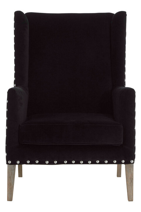 Silver coloured metal studs form a reflective trim around the Kensington Townhouse outer edge, accentuating its high back and winged arms. Its thick padded seat and backrest adds comfort to the design aesthetic. Tapered legs made from solid oak wood complement the sleek black. materials: Metal/Wood/Synthetic/Textile composition:Metal 0%,Oak Wood 0%,Foam 0%,Polyester Mix 0% Capacity: 200Kg Care & Use Instr: Wipe clean with a damp cloth Dishwasher Safe: N Electric Hob Safe: N Freezer Safe: N Gas Hob Safe: N Halogen Hob Safe: N Induction Hob Safe: N Materials: Metal/Wood/Synthetic/Textile Microwave Safe: N Oven Safe: N Product Depth: 75 Product Height: 107 Product Weight (kg): 21.5 Product Width: 89 Item Assembled: N Courier Service: Evri Light & Large
