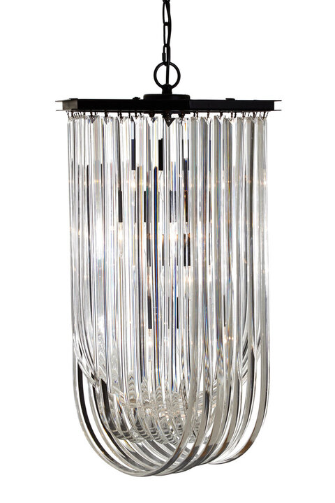 The light's strong iron frame and tough link chain produce a counterpoint to the delicate crystal beneath. The bulbs are partly concealed by the differing lengths of crystal strip, each one curving at the bottom before returning to the frame above. When lit, the crystal will refract the light, creating a beautiful effect which will enhance boutique hotel-inspired interiors. materials: Metal, Glass composition:Metal, Textile Bulb Included: N Bulb Info: 4 Qty E14 40W Care & Use Instr: Wipe clean with a soft cloth Dishwasher Safe: N Electric Hob Safe: N Freezer Safe: N Gas Hob Safe: N Halogen Hob Safe: N Induction Hob Safe: N Materials: Metal, Glass Microwave Safe: N Oven Safe: N Product Depth: 39 Product Height: 130 Product Weight (kg): 13 Product Width: 39 Item Assembled: N