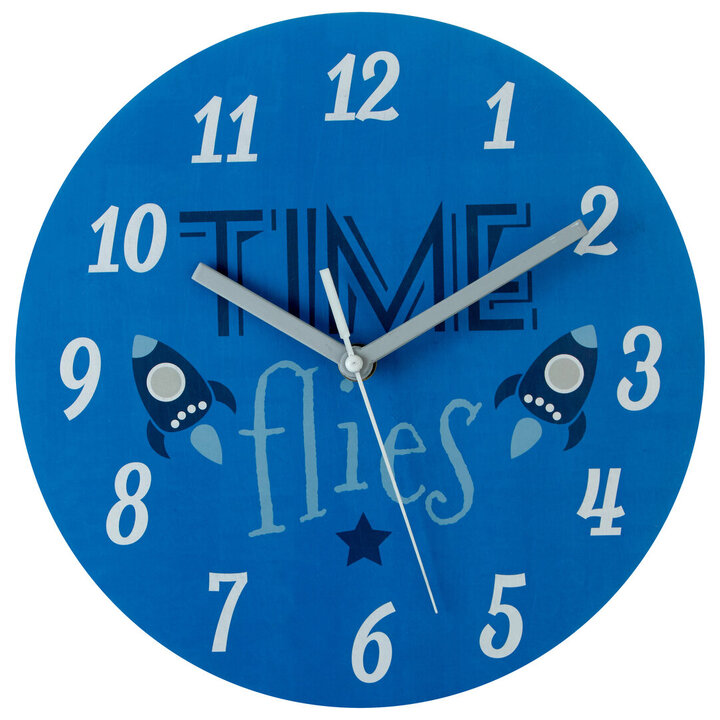 "The minute and hour hands stand out against this wall clock's dark blue background. With white, easy to read numbers, this clock helps children to learn this important skill. A pair of fun rocket ships blast off in opposite directions, while the bold 'Time Flies' message creates a clever pun which children will love." materials: Wood composition:50% Wood, 5% Paper, 28% Glass, 3% Aluminium, 9% Acrylic, 5% Plastic colour: Blue Care & Use Instr: Wipe With A Clean Soft Cloth Dishwasher Safe: N Electric Hob Safe: N Freezer Safe: N Gas Hob Safe: N Halogen Hob Safe: N Induction Hob Safe: N Materials: Wood Microwave Safe: N Oven Safe: N Product Depth: 4 Product Height: 25 Product Weight (kg): 0.35 Product Width: 25 Item Assembled: Y Courier Service: Evri Packet