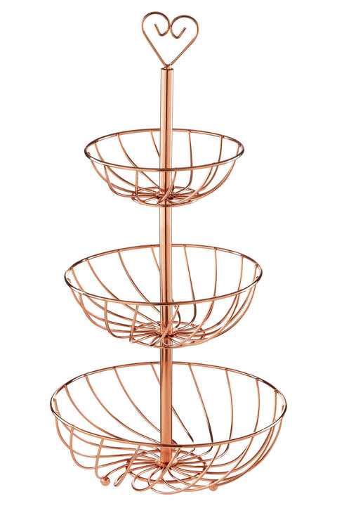 The Kuper three tiered fruit basket is constructed with rose gold iron creating a glamourous appeal. The three tiers provide ample space while ensuring the stability of the stand. materials: Metal composition:Iron 100% colour: Gold Care & Use Instr: Wash in warm soapy water Dishwasher Safe: N Electric Hob Safe: N Freezer Safe: N Gas Hob Safe: N Halogen Hob Safe: N Induction Hob Safe: N Materials: Metal Microwave Safe: N Oven Safe: N Product Depth: 31 Product Height: 63 Product Weight (kg): 2.05 Product Width: 31 Item Assembled: Y Courier Service: Evri Parcel