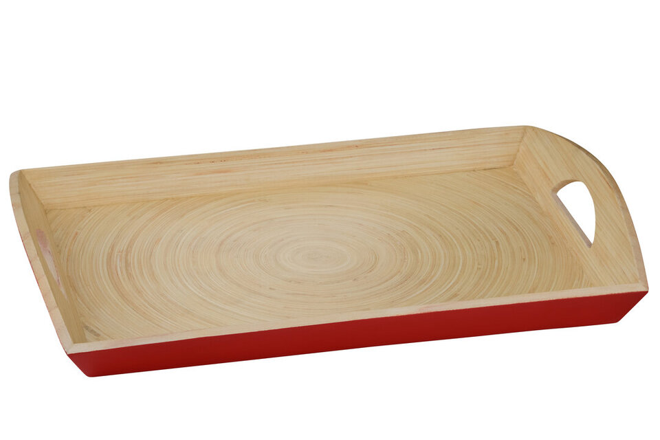 Made using spun bamboo, this serving tray is strong, durable and easy to clean with a damp cloth making it perfect for everyday use in a busy home. The spun design adds robustness making it suitable for serving hot and cold food. materials: Wood composition:Bamboo 100% colour: Natural, Red Care & Use Instr: Don't soak in water Dishwasher Safe: N Electric Hob Safe: N Freezer Safe: N Gas Hob Safe: N Halogen Hob Safe: N Induction Hob Safe: N Materials: Wood Microwave Safe: N Oven Safe: N Product Depth: 30 Product Height: 7 Product Weight (kg): 0.8 Product Width: 45 Item Assembled: Y Courier Service: Evri Packet