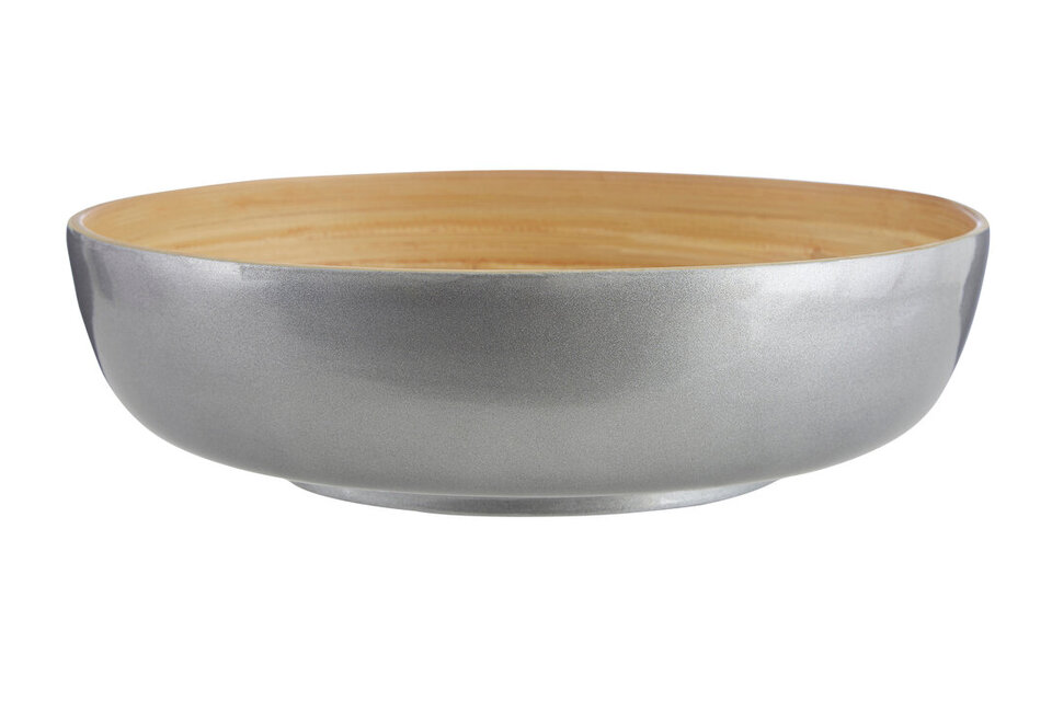 "Each Kyoto bowl is spun by hand to create the distinctive ringed effect on its golden interior. Naturally stain-resistant, its flat base and curved side add contemporary design to worktops. Its silver finish makes it suited to coordinating with metallic kitchen accessories. Use it with the Kyoto salad servers. *This item is handcrafted so please expect slight variations to the finish*" materials: Wood composition:Bamboo 100% colour: Silver Capacity: 2Kg Care & Use Instr: Don't soak in water Dishwasher Safe: N Electric Hob Safe: N Freezer Safe: N Gas Hob Safe: N Halogen Hob Safe: N Induction Hob Safe: N Materials: Wood Microwave Safe: N Oven Safe: N Product Depth: 30 Product Height: 8 Product Weight (kg): 0.5 Product Width: 30 Item Assembled: Y Courier Service: Evri Packet