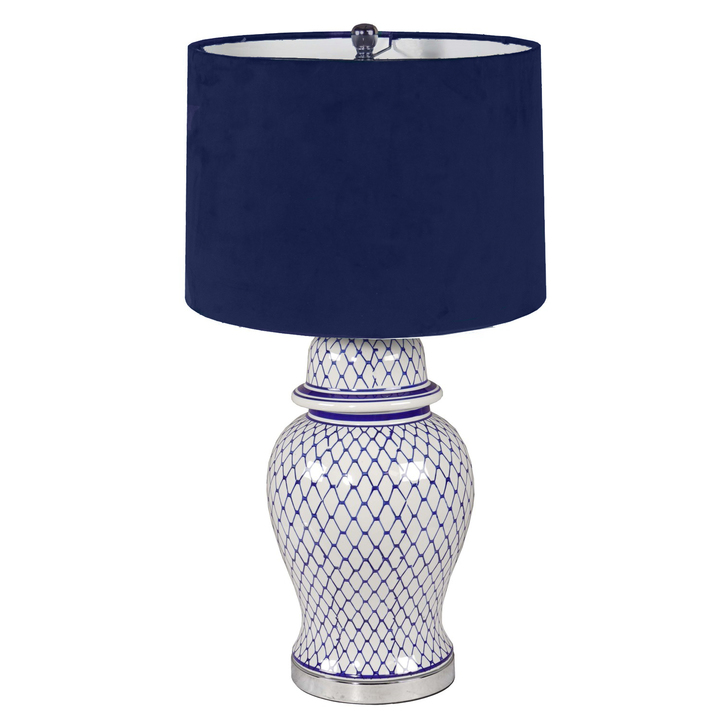 Infuse your space with cultural refinement through this meticulously detailed ceramic lamp, showcasing a traditional ginger jar silhouette adorned with intricate blue and white patterns that echo the artistry of fine porcelain. The harmonious design marries Eastern influences with contemporary style, while the luxurious blue velvet shade, crowned with a distinctive ball finial, adds an opulent touch to the overall aesthetic. This extraordinary piece serves as a brilliant anchor for any design scheme, particularly when paired with complementary accessories like the Large Ceramic Adele Shell Bowl or the Tiber Large Matt White Ceramic Vase. For maximum visual impact, consider styling alongside decorative mirrors such as the Chico Black Wire Mirror or the Decorative Hanging Silver Mirror, which will amplify the lamp's lustrous glazed finish. The addition of faux botanicals, such as the Grey Large Faux Pampas Grass Stem or Large Stone Potted Orchid, creates a cohesive design narrative that your customers will find irresistible. This lamp represents an investment in style that maintains its appeal across seasons and design trends, making it an essential addition to any carefully curated retail collection.