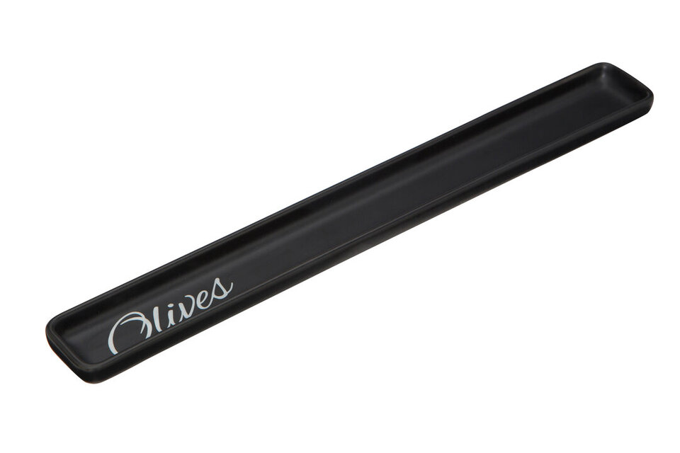 "Elegant in design, practical in use, the chic Mange rectangular olive dish will add a sense of occasion each time you use it, making you the host with the most. The sleek plate is made from durable stoneware, which is easy to clean, and given a neat matte black finish accentuating its sharp design. A small lip around the edge helps to stop your olives from sliding off, while keeping their stones on. On the plate, elegantly written 'Olive' detail adds a stylish finish. A wonderful way to serve up delicious appetisers the Mange olive dish is ideal for parties and movie nights with friends and family."