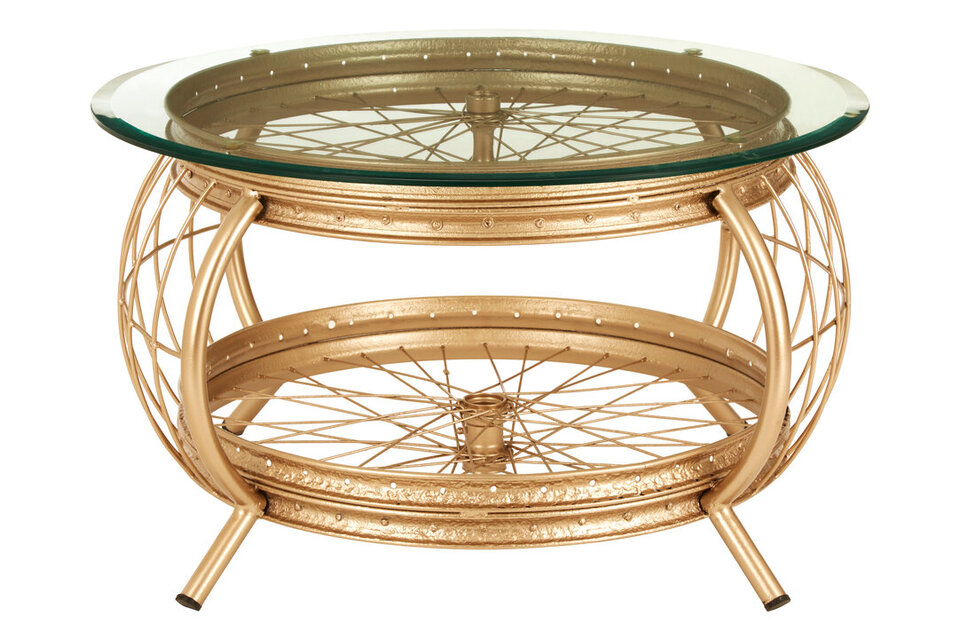 A round, clear glass top allows the table's bicycle spoke style frame to be fully visible. The intricate iron frame boasts an elegant champagne gold finish. materials: Metal, Glass composition:100% Capacity: 25Kg Care & Use Instr: Wipe Clean With A Soft Cloth. Do Not Use Abrasive Cleaners. Dishwasher Safe: N Electric Hob Safe: N Freezer Safe: N Gas Hob Safe: N Halogen Hob Safe: N Induction Hob Safe: N Materials: Metal, Glass Microwave Safe: N Oven Safe: N Product Depth: 80 Product Height: 46 Product Weight (kg): 10 Product Width: 80 Item Assembled: Y