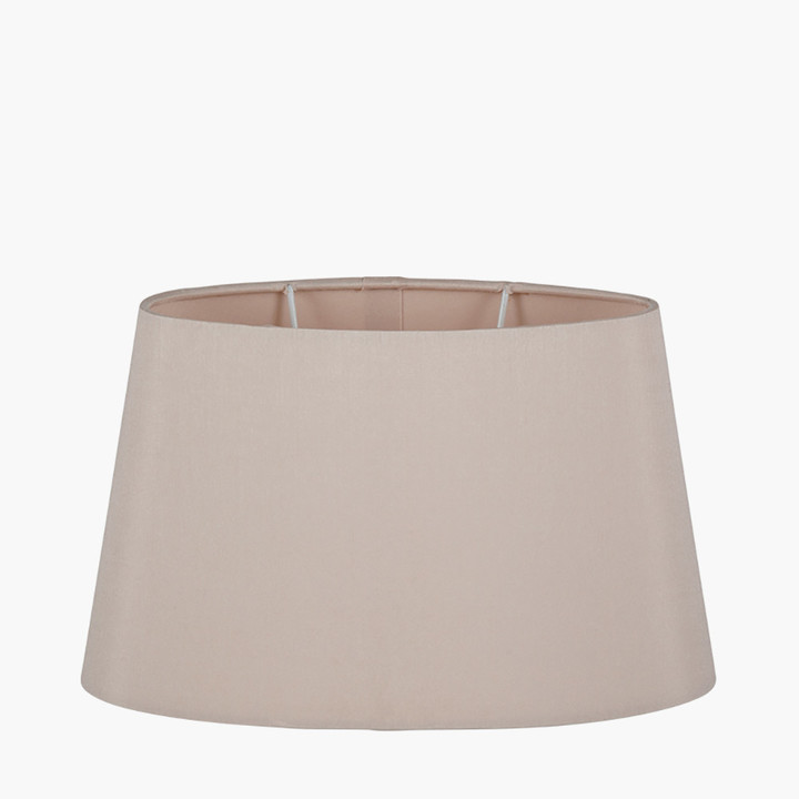 This elegant 45cm tapered oval shade in a rich taupe colour silk mix is self-lined which creates a warm glow when lit. This shade is the perfect size for a lamp on a console table or smaller space. Brochure Box Type: Shades CBM: 0.1202 Country of origin: China Is the shade reducer / adaptor included?: Yes Mail order packaging: 3 Master code: 36-036-18TA Material 1: Polysilk Material 2: PVC Material composition (%): Polysilk 85%, PVC 15% Max wattage: 10-12W LED Number of product boxes: 0 Outer box depth (front to back): 57 Outer box height (top to bottom): 49 Outer box quantity: 8 Outer box weight: 4.9000000000000004 Outer box width (side to side): 48 Packaging status: 3 Polybag warning label: Yes Product status: 3 Product weight: 0.42 Shade lining colour and material: Matching self-lining Shade struts number and colour: 4 White Single product depth (front to back): 27 Single product height (top to bottom): 25 Single product width (side to side): 45 Spec sheet: Tapered Shades Tapered shade top depth (front to back): 20 Tapered shade top width (side to side): 35 User guide included: No Variant position: 1 Colour 1: Brown Colour 2: n/a