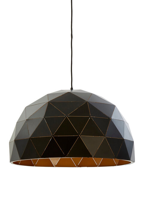 The shade is composed of a series of triangular forms made from tough steel. The jet black finish and exquisite copper interior make it easy to coordinate with a variety of design themes. A simple black cord suspends the light from the ceiling. materials: Metal composition:10% Wire, 60% Glass, 30% Iron Bulb Included: N Bulb Info: 3 Qty E27 60W Max Care & Use Instr: Wipe Clean With A Damp Cloth Dishwasher Safe: N Electric Hob Safe: N Freezer Safe: N Gas Hob Safe: N Halogen Hob Safe: N Induction Hob Safe: N Materials: Metal Microwave Safe: N Oven Safe: N Product Depth: 61 Product Height: 41 Product Weight (kg): 6.2 Product Width: 61 Item Assembled: Y