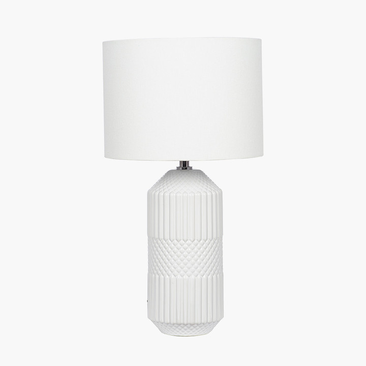 This beautiful tall ceramic table lamp features a textured tactile detail. Finished in a simple white glaze this lamp also comes complete with a matching white shade to finish the clean neutral look. Adjustable head: No Base depth (front to back): 12 Base height (top to bottom): 34 Base weight: 1.22 Base width (side to side): 12 Brochure Box Type: Complete Brochure Description: White Geo Textured Tall Ceramic Table Lamp Brochure Name: Meribel Bulb shape: GLS Bulb type: E27/ES CBM: 3.4099999999999998E-2 Cable colour and material: Black, Plastic Cable type: 2 x 0.75mm² Country of origin: China Dimmable: No Felt base/feet: Felt base IP rating: 20 Lampholder casing: Yes Lampholder casing finish: Chrome Lampholder colour: Black Lampholder type: E27 Lighting Class: Class 2 Mail order packaging: 1 Master code: 30-786-C Material 1: Ceramic Material 2: Polycotton Material composition (%): Ceramic 90%, Polycotton 10% Max wattage: 10-12W LED Number of bulbs: 1 Number of product boxes: 1 Outer box depth (front to back): n/a Outer box height (top to bottom): n/a Outer box quantity: n/a Outer box weight: n/a Outer box width (side to side): n/a Packaging status: 3 Plug: UK 3 pin with 3 amp fuse Plug colour: Black Polybag warning label: Yes Product status: 3 Product weight: 1.42 Shade Colour: White Shade Material: Polycotton Shade depth (front to back): 25 Shade height (top to bottom): 18 Shade lining colour and material: White, PVC Shade struts number and colour: 3 White Shade weight: 0.2 Shade width (side to side): 25 Single product depth (front to back): 25 Single product height (top to bottom): 46 Single product width (side to side): 25 Spec sheet: Complete Switch: In-line Switch colour: Black Tapered shade top depth (front to back): n/a Tapered shade top width (side to side): n/a Tube riser: 1.7 x 2 cm UKCA/CE label: Yes User guide included: No Variant position: 1 Colour 1: White Colour 2: n/a
