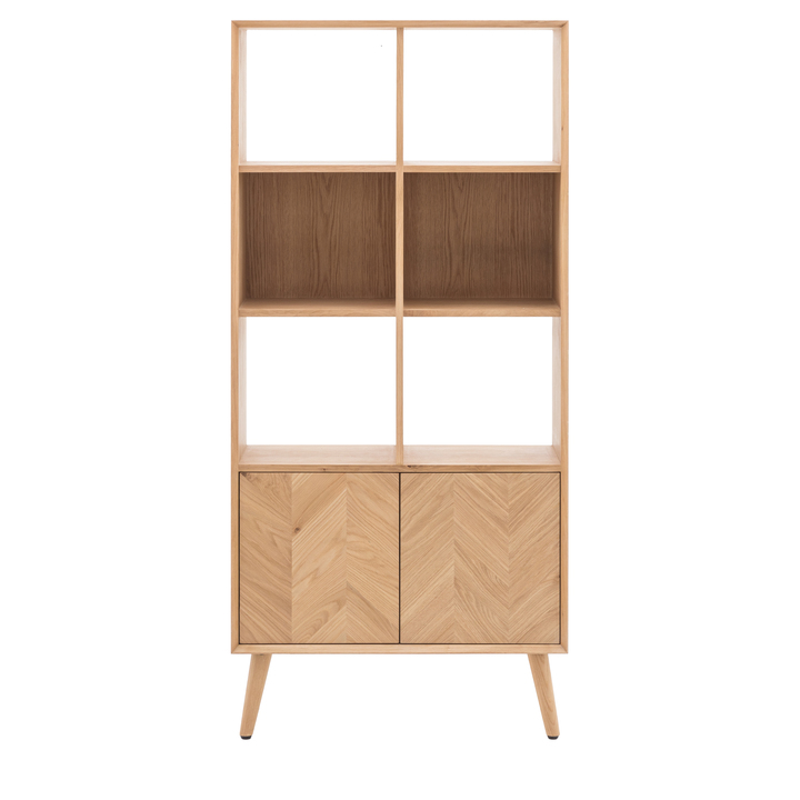 Our popular collection has been extended with the addition of this beautiful display unit, plus a two-drawer coffee table and round dining table. All featuring an eye-catching chevron design and specialist mat lacquer which keeps the timber looking natural and dry, with brushed out grain. Material: Oak / Oak Veneer / MDF Product Zone: Indoor Clearance to Floor: 200mm Storage: 2 Doors / 2 Shelves Internal Cupboard Size: 371 x 302mm Adjustable Shelves: Yes Distance between shelves: 326mm Assembly Required: Leg / Foot Only