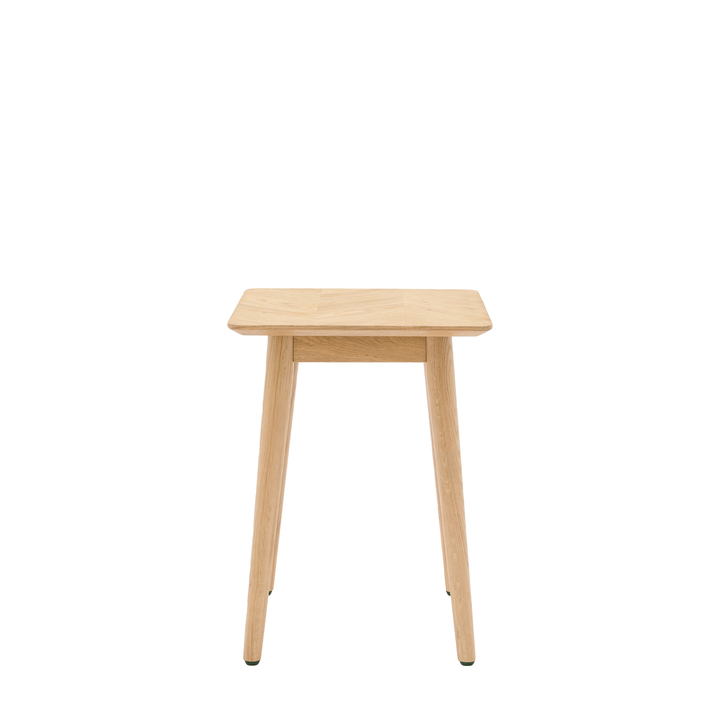 This stunning 1 drawer side table features a beautiful inlay chevron design, made using European oak and rustic oak structured veneers which show the natural beauty of the oak grain and knots. Finished in a specialist mat lacquer, which keeps the timber looking natural and dry, with brushed out grain, the table is tactile to touch and looks amazing. Material: Oak / Oak Veneer / MDF Assembly Required: Leg / Foot Only