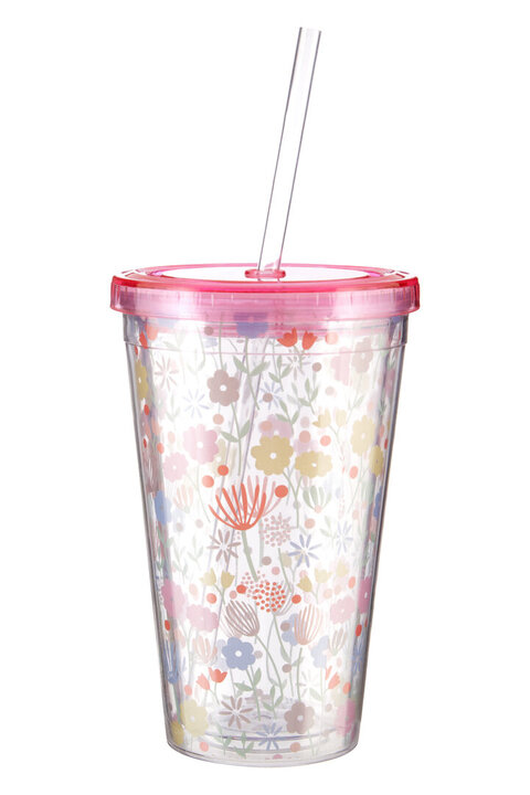 The tapered cup has a double walled build which keeps its contents cool, and boasts a colourful floral design. The plastic is clear to match the straw, the latter with a catch that prevents it from slipping out of the pink lid. materials: Synthetic composition:Polyvinyl chloride 50%,Acrylonitrile Styrene 50% colour: Pink Capacity: 450ml Care & Use Instr: Wash before first use with warm soapy water. Do not use abrasive cleaners Dishwasher Safe: N Electric Hob Safe: N Freezer Safe: N Gas Hob Safe: N Halogen Hob Safe: N Induction Hob Safe: N Materials: Synthetic Microwave Safe: N Oven Safe: N Product Depth: 10 Product Height: 17 Product Weight (kg): 0.2 Product Width: 10 Item Assembled: Y Courier Service: Evri Packet