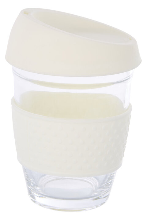 This clear glass mug with tapered sides is designed to keep drinks cool or warm for longer. A cream silicone wrap in minimal texture provides a secure grip and prevents slip, matched with a slanting lid for effortless slipping. materials: Metal, Glass composition:Silicon 50%,Glass 50% colour: Clear, Cream Capacity: 350ml Care & Use Instr: Wash in warm soapy water Dishwasher Safe: Y Electric Hob Safe: N Freezer Safe: Y Gas Hob Safe: N Halogen Hob Safe: N Induction Hob Safe: N Materials: Metal, Glass Microwave Safe: N Oven Safe: N Product Depth: 9 Product Height: 13 Product Weight (kg): 0.38 Product Width: 9 Item Assembled: Y Courier Service: Evri Packet