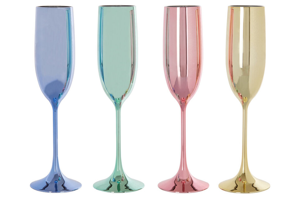 This set of four champagne flutes come in assorted shades while each having a reflective electroplated finish. Each glass has a round bowl connected to a thin stem that gives it a sleek aesthetic. materials: Synthetic composition:Plastic 100% colour: Assorted Capacity: 180ml Care & Use Instr: Wash in warm soapy water Dishwasher Safe: N Electric Hob Safe: N Freezer Safe: Y Gas Hob Safe: N Halogen Hob Safe: N Induction Hob Safe: N Materials: Synthetic Microwave Safe: N Oven Safe: N Product Depth: 8 Product Height: 23 Product Weight (kg): 0.5 Product Width: 8 Item Assembled: Y Courier Service: Evri Packet