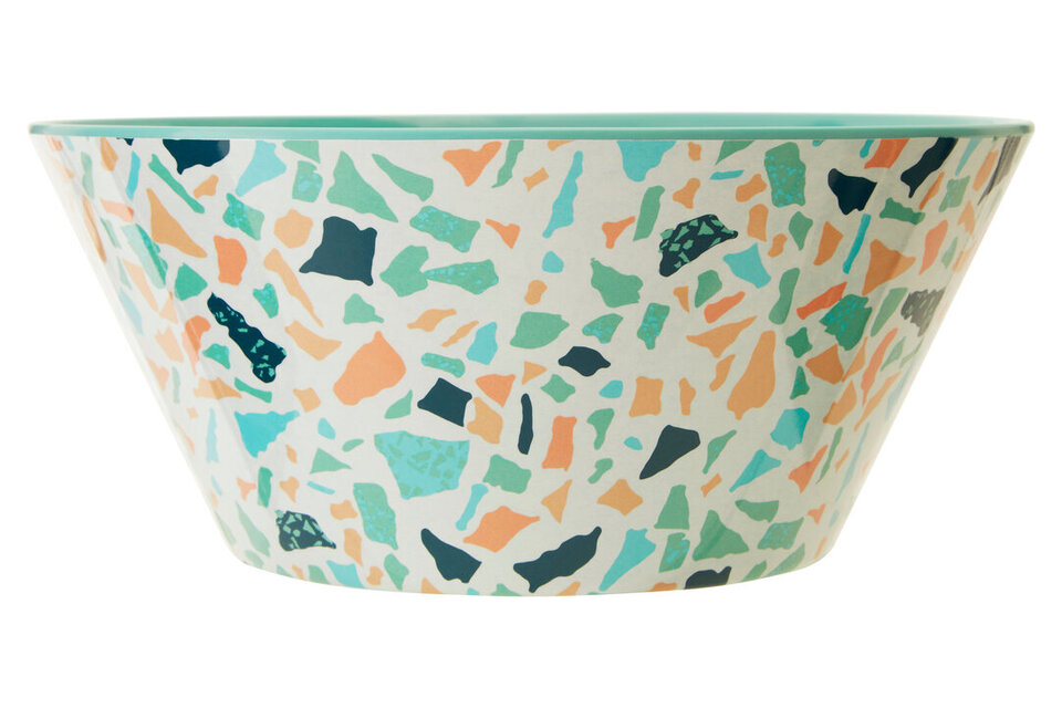 "The bowl features a terrazzo pattern which adorns its plain white outer. Made from robust melamine, it has a tapered design with a soft green inner and rim. Suitable for outdoor use, it's just as home on the picnic table as it is in the kitchen." materials: Synthetic composition:Melamine 100% colour: Assorted Capacity: 4L Care & Use Instr: "Wash Before Use In Warm, Soapy Water. Rinse And Towel Dry" Dishwasher Safe: N Electric Hob Safe: N Freezer Safe: N Gas Hob Safe: N Halogen Hob Safe: N Induction Hob Safe: N Materials: Synthetic Microwave Safe: N Oven Safe: N Product Depth: 26 Product Height: 11 Product Weight (kg): 0.33 Product Width: 26 Item Assembled: Y Courier Service: Evri Packet
