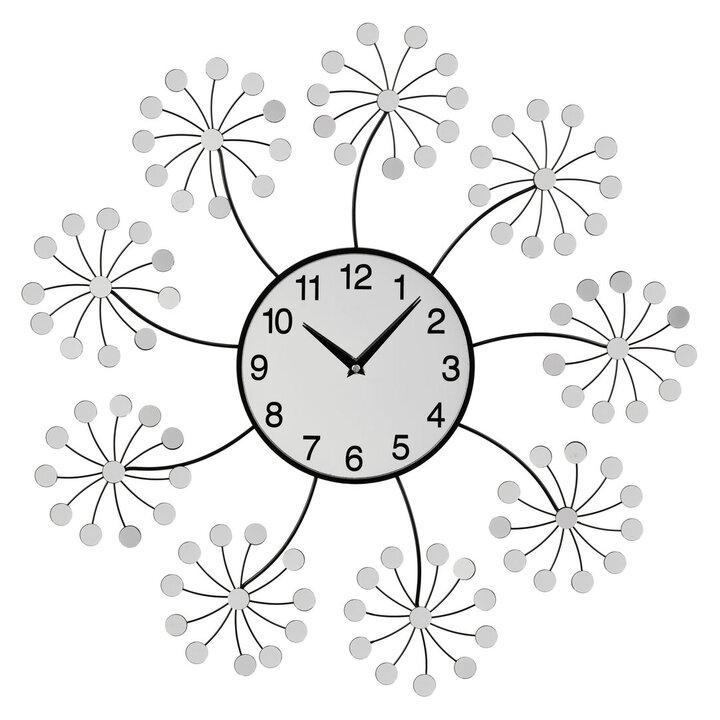 Extending from the dial are beautiful floral patters that make the wall mirror a striking timepiece. The dial has bold, black numbers contrasting against a silver background making it easy to read the time. materials: Metal composition:100% Iron colour: Silver Bulb Included: N Care & Use Instr: Clean With Soft Damp Cloth . Do Not Use Abrasive Cleaners Dishwasher Safe: N Electric Hob Safe: N Freezer Safe: N Gas Hob Safe: N Halogen Hob Safe: N Induction Hob Safe: N Materials: Metal Microwave Safe: N Oven Safe: N Product Depth: 5 Product Height: 60 Product Weight (kg): 1.1 Product Width: 60 Item Assembled: Y Courier Service: Evri Packet