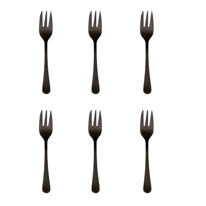 "This six piece cake fork set is made from non-corrosive stainless steel, and each piece has a matte black finish." materials: Metal composition:Stainless Steel 100% colour: Black Care & Use Instr: Dishwasher Safe. Do Not Use Abrasive Cleaners Dishwasher Safe: N Electric Hob Safe: N Freezer Safe: N Gas Hob Safe: N Halogen Hob Safe: N Induction Hob Safe: N Materials: Metal Microwave Safe: N Oven Safe: N Product Depth: 3.5 Product Height: 3 Product Weight (kg): 0.12 Product Width: 14.5 Item Assembled: Y Courier Service: Evri Packet