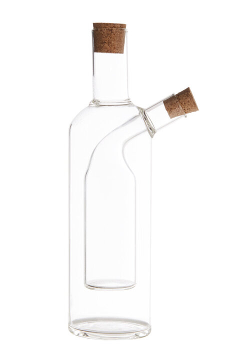 Crafted from borosilicate glass, the two-in-one oil and vinegar container has a large bottle of 275ml to store oil with a small one of 90ml to store vinegar. Featuring a nesting design, each bottle is topped with a natural cork lid that is airtight and preserves flavours. materials: Wood, Glass composition:Cork 10%,Glass 90% colour: Natural, Clear Capacity: 260kgs Care & Use Instr: Wash in warm soapy water Dishwasher Safe: Y Electric Hob Safe: N Freezer Safe: Y Gas Hob Safe: N Halogen Hob Safe: N Induction Hob Safe: N Materials: Wood, Glass Microwave Safe: N Oven Safe: N Product Depth: 6 Product Height: 21 Product Weight (kg): 0.17 Product Width: 8 Item Assembled: Y Courier Service: Evri Packet