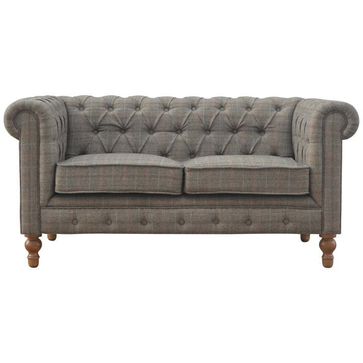 Short Description: This Chesterfield 2 Seater Sofa is fully upholstered in multi tweed and is constructed from 100% solid mango wood. This 2 seater sofa is detailed with deep button tufts, piping and sheltering arms. This country tweed sofa also features hand turned legs with a fine natural bleach finish. You may encounter variations from batch to batch hence if you are looking to pair products under similar room settings; you can opt for a bespoke order or take an informed decision about the possible variations. Product to be delivered on the pallet as a pavement/kerbside delivery. Customer needs to dispose off or use it if they wish to. For possible returns, we would require the original pallet alongside full packaging as part of returns policy. Assembly Instructions: Fully Assembled Product Weight: 42