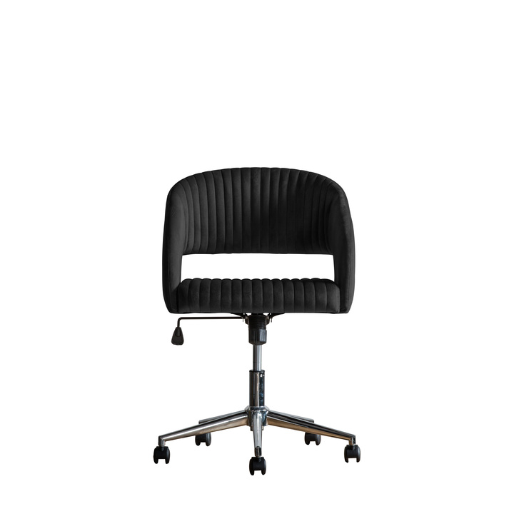 Add a touch of glamour to a home office with this sophisticated swivel chair. Upholstered in tactile black velvet which pairs beautifully with the silver base, the chair offers style, comfort and practicality. The padded back and seat feature stitch detailing, whilst castors give easy manoeuvrability, plus there is tilt adjustment and gas lift seat height adjustment. Also available in four other colours. Material: Iron / Plywood / Polyester / Foam / Nylon Seat Height: 610mm Seat Width between arms: 475mm Seat Depth: 440mm Assembly Required: Yes Additional Information: Adjustable Height: 860 - 960mm. Adjustable Seat Height: 510 - 610mm