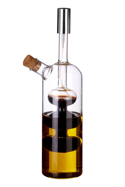 Deposit oil in the bottle's large section, and keep vinegar in the smaller compartment. A cork stopper prevents oil spills, while the sprayer allows uniform spritz of vineger. Its striking aesthetic makes for a beautiful display piece in the kitchen. materials: Wood, Glass, Synthethic composition:Plastic 3%,Cork 3%,Glass 94% colour: Clear Capacity: 250ml Care & Use Instr: Wash in warm soapy water Dishwasher Safe: N Electric Hob Safe: N Freezer Safe: N Gas Hob Safe: N Halogen Hob Safe: N Induction Hob Safe: N Materials: Wood, Glass, Synthethic Microwave Safe: N Oven Safe: N Product Depth: 6 Product Height: 22 Product Weight (kg): 0.15 Product Width: 9 Item Assembled: Y Courier Service: Evri Packet