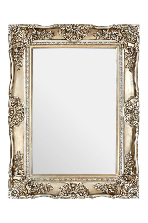 This large rectangular mirror's thick frame is replete with carved foliage motifs and intricate dentil detailing. Their symmetrical arrangement combines with the champagne gold finish to lend an antique look to the mirror. materials: Glass, Wood, Natural composition:MDF 0%,Mirrored Glass 0%,Resin 0% colour: Gold Care & Use Instr: Wipe Clean With A Soft Cloth. Do Not Use Abrasive Cleaners. Dishwasher Safe: N Electric Hob Safe: N Freezer Safe: N Gas Hob Safe: N Halogen Hob Safe: N Induction Hob Safe: N Materials: Glass, Wood, Natural Microwave Safe: N Oven Safe: N Product Depth: 6 Product Height: 110 Product Weight (kg): 13 Product Width: 80 Item Assembled: Y Courier Service: BSTAR 1MAN