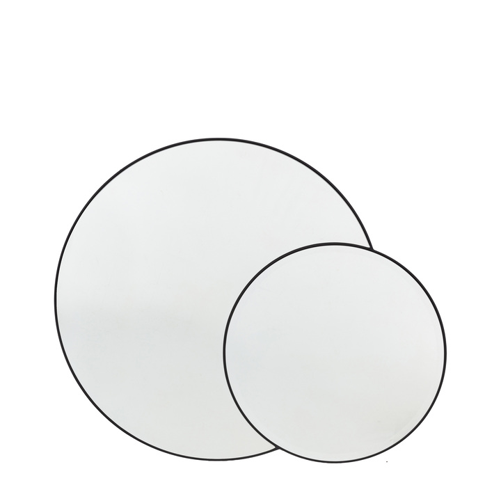 Contemporary style mirror which is a decorative piece of art in itself with interlocking circular shapes. Add some visual intrigue onto your walls with this lovely mirror with contemporary black frames. Material: MDF / Glass Type - Mirror: Wall Style - Mirror: Modern Shape - Mirror: Round Hanging Orientation: Portrait Glass Type: Bevelled Glass Size mm: 1070 Bevel Size: 20mm Frame Width: 5mm Frame Colour: Black Fixing Type: D-Ring Anti Topple Kit Included: Yes Additional Information: Diameter of smaller mirror is 598mm