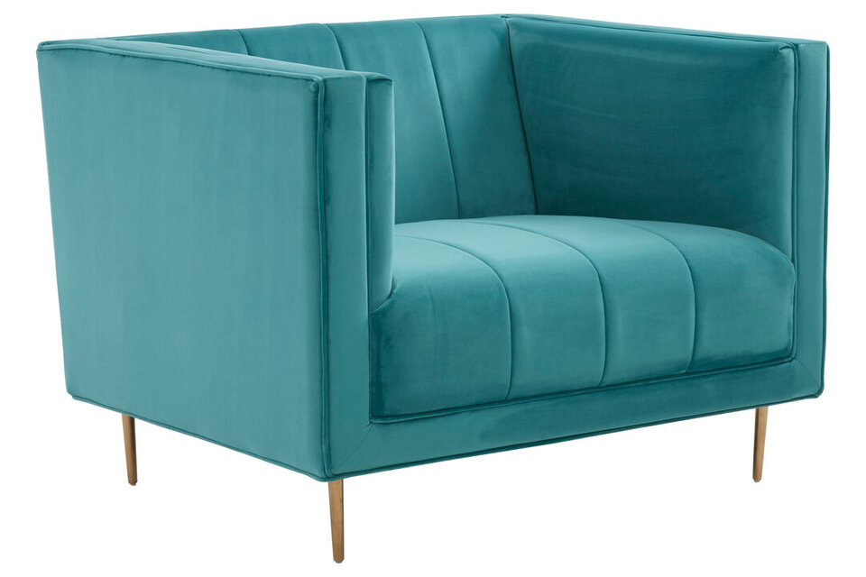 Upholstered in plush teal velvet, this armchair comes in thick padding featuring minimal channel detail. The warm metallic stainless steel base furthers the luxe accent and harmonises with vertical lines along with the seat and backrest. materials: Metal, Textile, Wood, Synthetic composition:60% Iron, 40% Cotton Capacity: 100Kg Care & Use Instr: "Keep the sofas in the dry place & use professional cleanser to clean the dirty fabric. Please note, this product composition contains natural wood, variations in colour may apply." Dishwasher Safe: N Electric Hob Safe: N Freezer Safe: N Gas Hob Safe: N Halogen Hob Safe: N Induction Hob Safe: N Materials: Metal, Textile, Wood, Synthetic Microwave Safe: N Oven Safe: N Product Depth: 86 Product Height: 75 Product Weight (kg): 20 Product Width: 99 Item Assembled: N