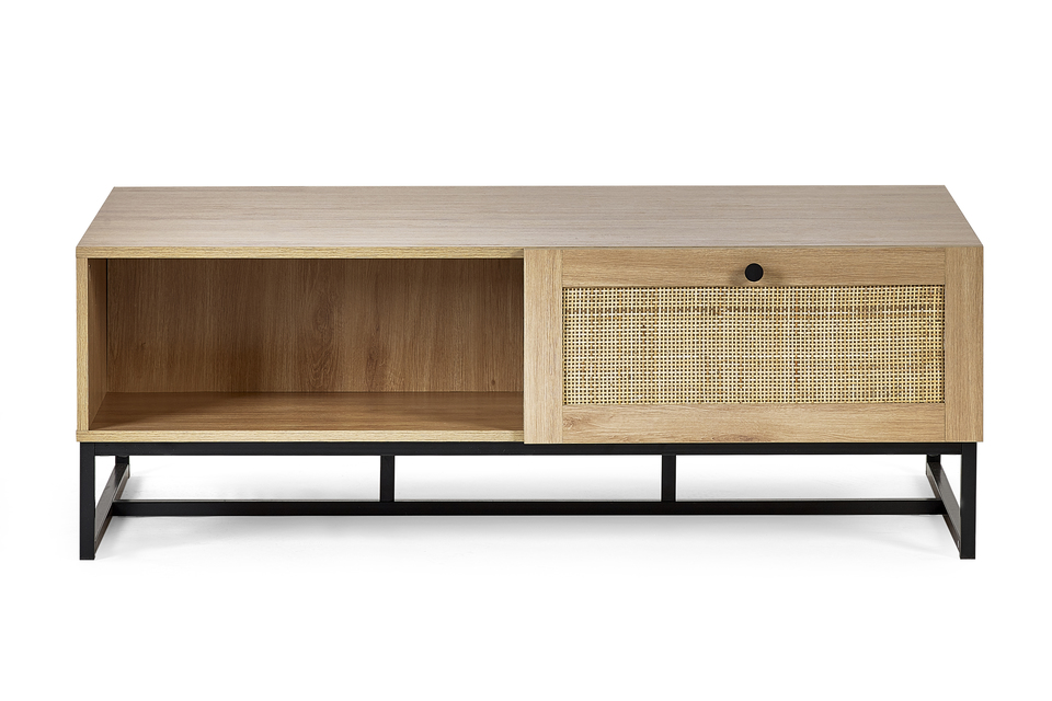 Materials: Melamine With Rattan Front & Metal Base {• |||product feature 1}• Industrial style base. • Available in Oak or Black. • H42 x W120 x D70cm, Weight 38.0kg • x1 Coffee Table. • DIMENSIONS: Height 42 x Width 120 x Depth 70cm, Net Weight 38.0kg • WHAT'S INCLUDED: You will receive x1 Coffee Table. Full Assembly Required. Level of Assembly Required: Full Assembly Required Build Time: 45.0 $ Total Net Weight: 38.0 Cleaning Instructions: Wipe Clean with Dry Cloth