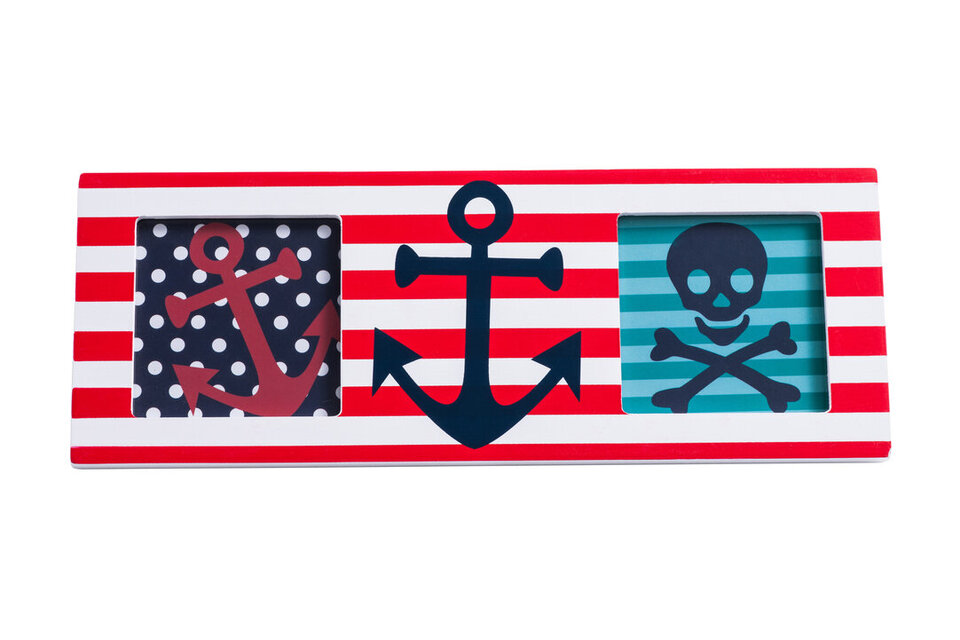 The frame has a red and white stripe design with an anchor in the centre accentuating the pirate look. Easy to clean with a dry dust cloth, you can have these wonderful focal points on yer wall for years me landlubbers. materials: Wood composition:80% Mdf, 20% Glass Care & Use Instr: Dust With Dry Cloth Dishwasher Safe: N Electric Hob Safe: N Freezer Safe: N Gas Hob Safe: N Halogen Hob Safe: N Induction Hob Safe: N Materials: Wood Microwave Safe: N Oven Safe: N Product Depth: 1 Product Height: 9 Product Weight (kg): 0.17 Product Width: 24 Item Assembled: Y