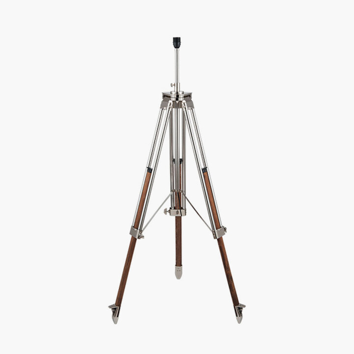 This oversized wooden handcrafted tripod lamp base has a modern twist to it with the addition of chrome metal detail on the legs. With the oak finish legs and the oversized feel to this lamp, nautical glamour has never been so contemporary. The height of the lamp holder and the legs can be adjusted to suit the needs of the room. Whether it's a coolie shade or a cylinder you use to personalise your look, you can't go wrong when shading this beautiful base. Recommended lampshade size: 45cm diameter