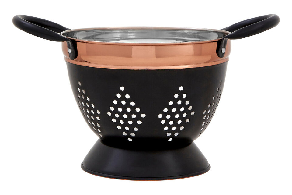 "Made from non-corrosive stainless steel, this colander is a durable as well as stylish accessory. It features wide handles, draining holes arranged into diamond shapes, and a charcoal and copper colour combination." materials: Metal composition:Stainless Steel 100% colour: Grey Capacity: 1700ml Care & Use Instr: Wipe Clean With A Soft Cloth. Do Not Use Abrasive Cleaners. Dishwasher Safe: N Electric Hob Safe: N Freezer Safe: N Gas Hob Safe: N Halogen Hob Safe: N Induction Hob Safe: N Materials: Metal Microwave Safe: N Oven Safe: N Product Depth: 18 Product Height: 12 Product Weight (kg): 0.3 Product Width: 26 Item Assembled: Y Courier Service: Evri Packet