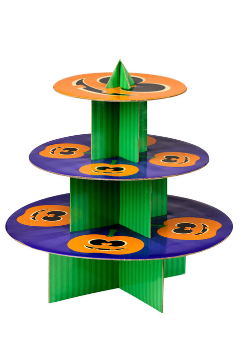 "The spooky design of the Pumpkin 3 tier cake stand will bring a sense of occasion and functionality each time you use it. A wonderful space saver, the stand can hold up to 28 cupcakes making it ideal for a ghoulish party. Made using strong cardboard and given a laminated finish, the traditional orange pumpkin design is accentuated on the purple background to create a striking focal point on your table. Durable and lightweight, the 3 tier Pumpkin cake stands spellbinding design can fold flat for compact storage making it perfect for every Halloween." materials: Synthetic composition:Cardboard 100% colour: Green, Orange, Purple Bulb Included: N Care & Use Instr: Wipe clean with a damp cloth. Do not use abrasive cleaner Materials: Synthetic Product Depth: 36 Product Height: 37 Product Weight (kg): 0.416 Product Width: 36 Item Assembled: Y Courier Service: Evri Packet